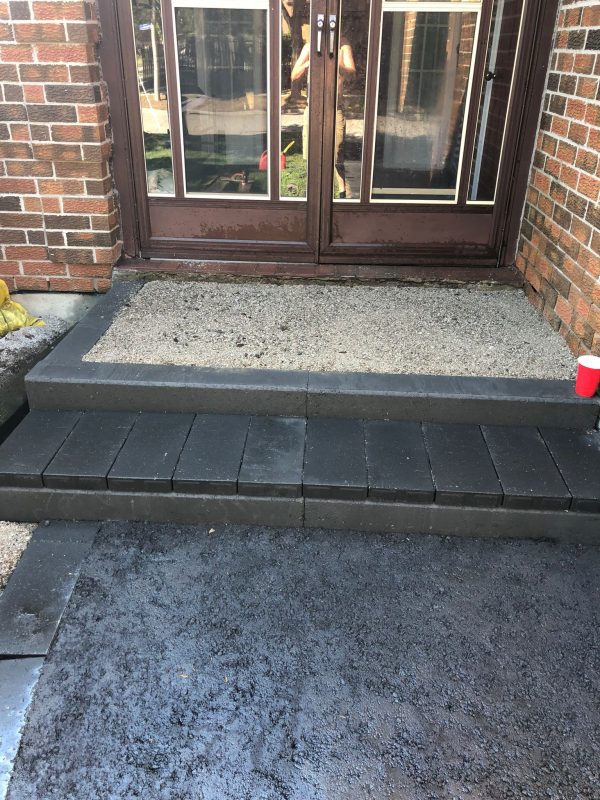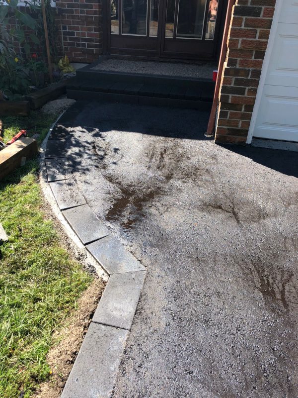Here is a new driveway installation completed using asphalt as the main surface, bordered with interlock pavers and a matching step built at the front door. The work itself was completed in less than 3 days from start to finish in Toronto.